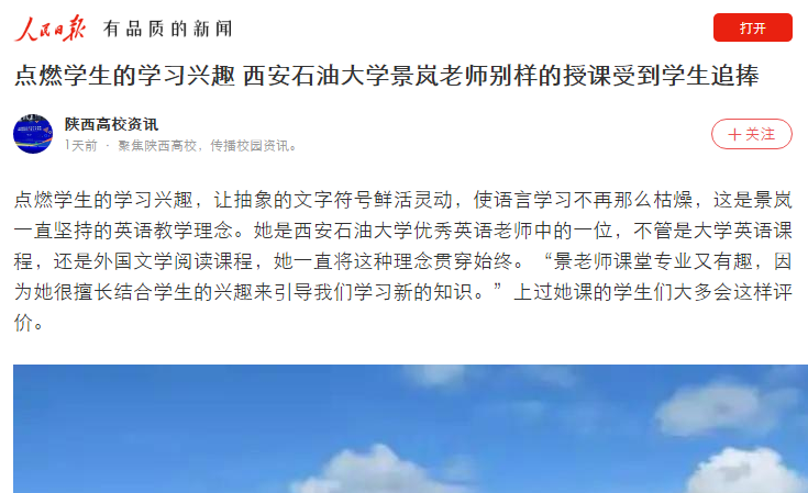 景嵐的努力學生們看在眼里記在心里。學生們常常會被她認真的準備和精彩的講解而感動。她的學生邱冬說:“景老師會耐心帶領我們學習課文的背景知識,拓寬我們的知識面。我知道,這一定需要她花費很多時間和精力備課。我要為景老師的認真負責點贊!”