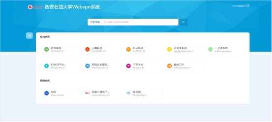 2.輸入統(tǒng)一身份認(rèn)證用戶名和密碼,即可進(jìn)入西安石油大學(xué)Webvpn系統(tǒng)資源導(dǎo)航界面,如下圖: